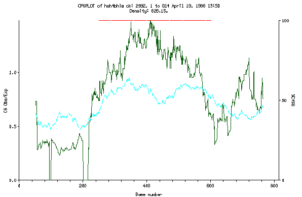 The algorithm used is described by Gardiner-Garden (1987); J. Mol. Biol. 196:261-282). The method is based on the calculation of a running average in a window that steps along the sequence at a specified shift. The observed/expected CpG ratio and the percentage of C's and G's is calculated within his window to produce the two numerical arrays plotted by the program.