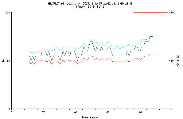 Here is a session with MeltPlot that was used to produce the melting temperature profile for the first 1000 bases of human low density lipoprotein receptor (GenEMBL:hsldlr), using a window of 20 bases, and a shift of one.