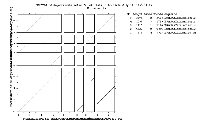 The output from PolyDot includes all the dotplots on a single page and to the same scale, a list of all identical regions of at least the selected length, and an input file for Segments to report the complete alignment around each detected match.