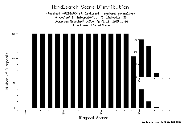 TWordSearch makes an output file of sequence names with a list of the best diagonals in your search and plots the distribution of scores from the search. Here is some of the output file: