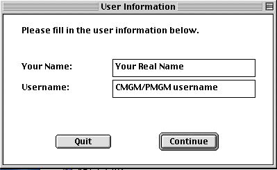 You will be asked for your real name and your CMGM/PMGM username. This is needed because CMGM/PMGM functions as the server that holds all the MDL databases. Your local computer is just a front end that helps you build queries to the Oracle database on CMGM/PMGM that stores all the information.